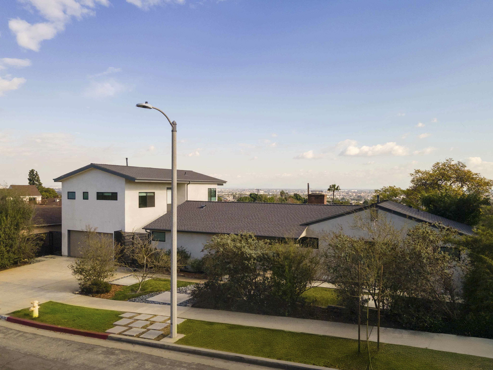 Welcome to this stunning contemporary home in the highly sought-after View Park neighborhood. The main residence boasts 2 bedrooms and 2 bathrooms, highlighted by wide-plank hardwood floors, a beautiful brick fireplace, and breathtaking views from practically every room. The tastefully remodeled kitchen showcases Caesarstone countertops, a pantry, and a pass-through window with bar seating, making it ideal for entertaining. The property also features a stunning 2-story guest house, permitted and constructed in 2019, which boasts incredible city views. The guest house is fully equipped with a complete kitchen, two bathrooms, motorized solar shades, and laundry hook-ups, providing all the essentials for comfortable living. It's perfect for a home office, accommodating guests, or serving as a lucrative rental opportunity. This remarkable property has undergone extensive updates, including a remodeled kitchen, bathrooms, hardwood flooring, new plumbing, an on-demand water heater, a soft water system, and a new HVAC system. Both the main residence and guest house have new roofs. Additionally, the sewer main has been updated, and the exteriors have been freshly re-stuccoed. Double-pane windows and doors enhance both comfort and efficiency. The property sits on a generous lot, offering so much opportunity for customization and expansion. The outdoor space has room for a pool, and there's an area prime for a vegetable garden, ideal for cultivating that farm-to-table vibe. Additionally, the backyard features a cozy brick fireplace, creating a perfect setting for outdoor gatherings and relaxation. Nestled in a vibrant community, this home is conveniently located near local hotspots like Jon & Vinny's, Hilltop Coffee & Kitchen, and Somerville. Enjoy outdoor activities at Rueben Ingold Park, Kenneth Hahn Park, and the Park to Playa Trail. Plus, benefit from easy access to the Expo and LAX lines for seamless commuting. This property is a perfect blend of modern upgrades and clean-lines contemporary style, offering a unique opportunity to own a piece of View Park's architectural history.